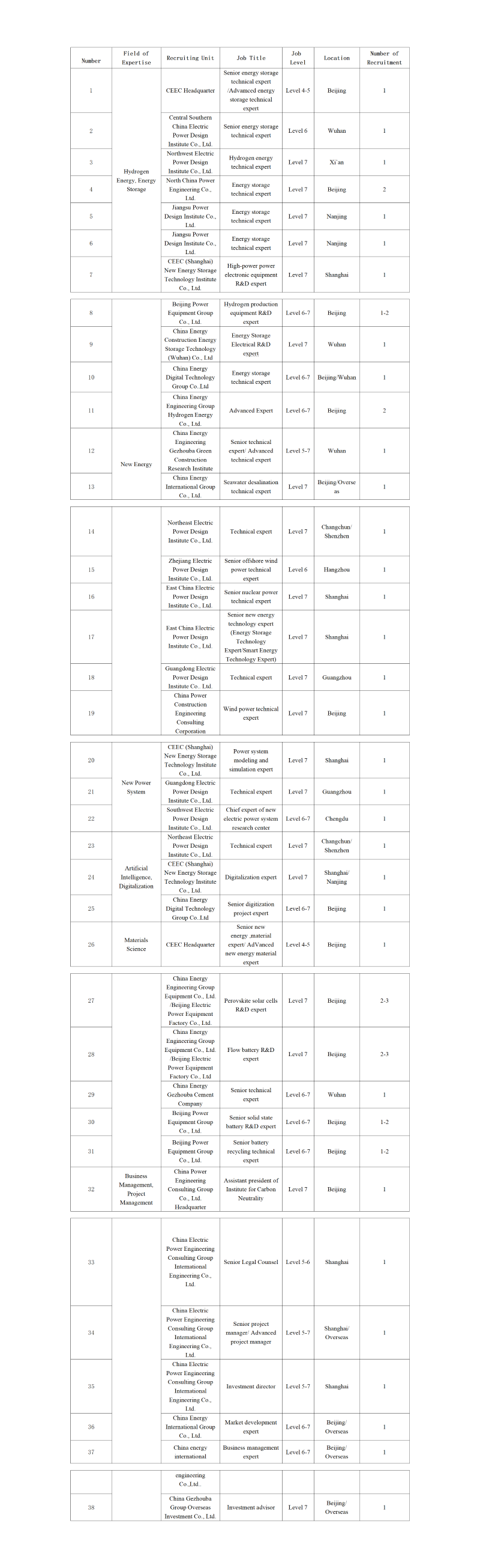 37 | 中國能源建設(shè)集團(tuán)國際工程有限公司 | 商務(wù)管理專家 | 6級(jí)-7級(jí) | 北京/ | 1人 | |